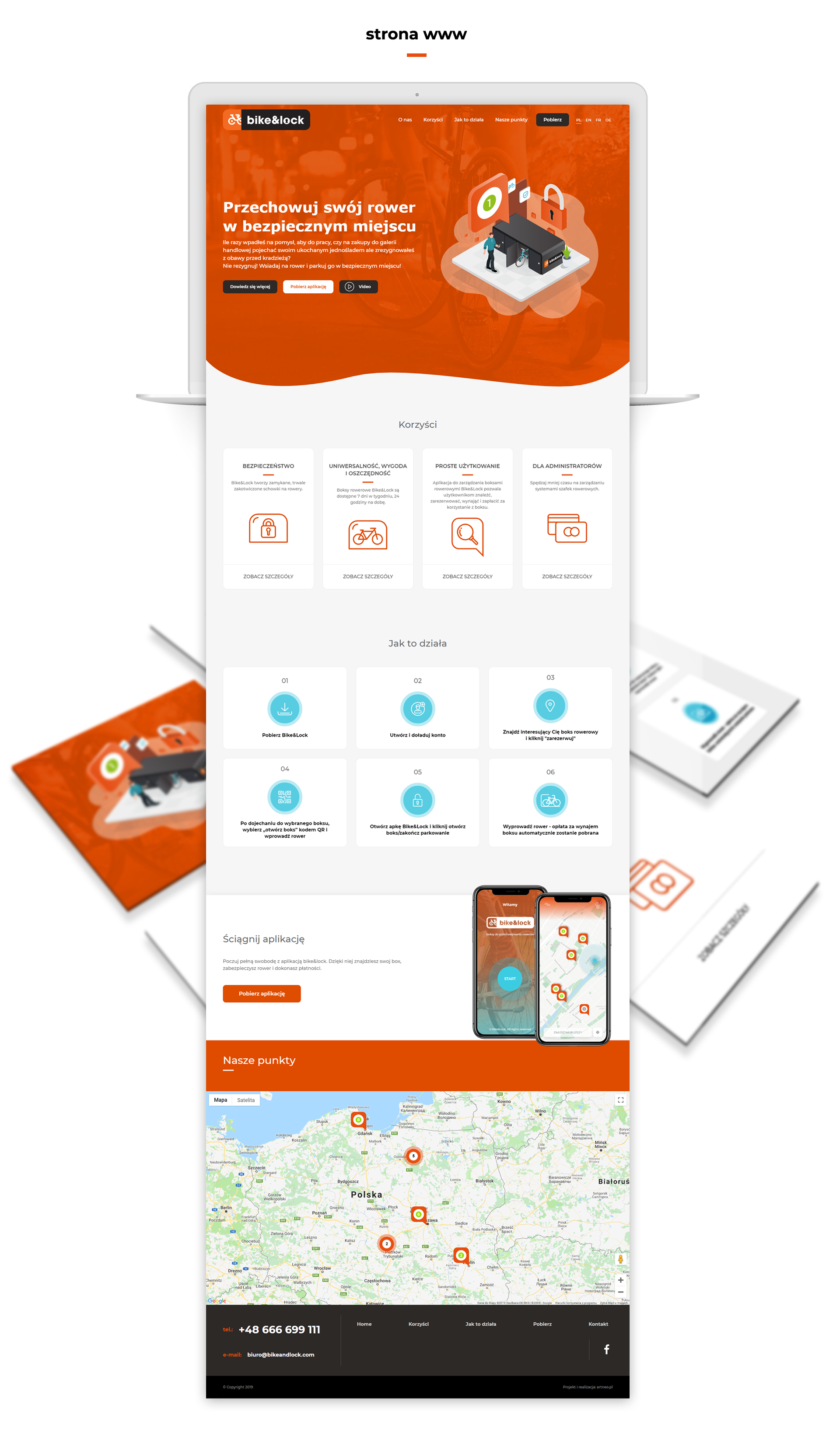 Logodesign. Skapande av en mobil applikation som gör det möjligt att boka och hantera cykelförvaring. Förberedelse av ett maximalt användarvänligt gränssnitt. Projektimplementering. 3D-rendering av cykelförvaringar. Förberedelse av visualisering.